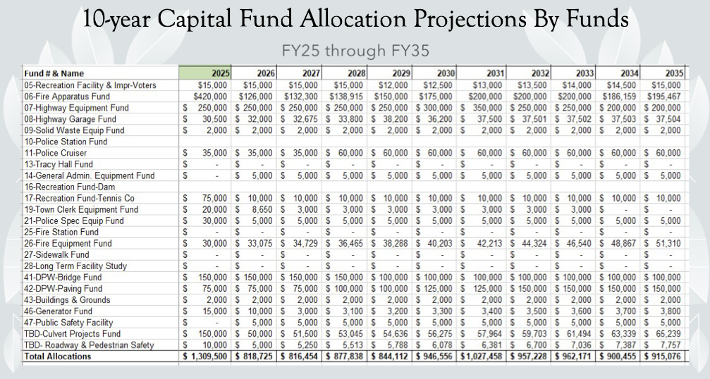 Capital Spending Plan Transparency. The Town is several years into its capital funding plan. The attached 10-year Capital Fund Allocation Projections (FY25–FY35) show future annual allocations across more than twenty funds, ranging from roughly $850,000 to $1,000,000 per year. Notably, the Tracy Hall Fund shows zero dollars allocated across all ten years, yet renovations to Tracy Hall are under active discussion. What is missing, however, is a capital spending plan. What are we saving this money for and why? How do we know if we are on or off target? Do requests to use designated funds line up with the planned uses? Are revisions appropriate? Without a plain-language capital plan, no one can meaningfully answer those questions. Budget season is not the optimal time to introduce or evaluate a capital plan.