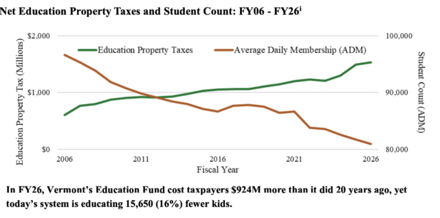 Sometimes a picture (or in this case, a graph) really is worth a thousand words. Two simple graphs tell you everything you need to know about an overlooked problem in Vermont’s education system. We are spending more but students are getting less. The Cost Crisis Over the past 20 years, Vermont’s education property taxes have increased by $924 million while the system educates 15,650 fewer students. Think about that: we’re spending a whole lot more to teach dramatically fewer (16% Continue reading Spending More, Getting Less: Vermont’s Education Problem in Two Graphs